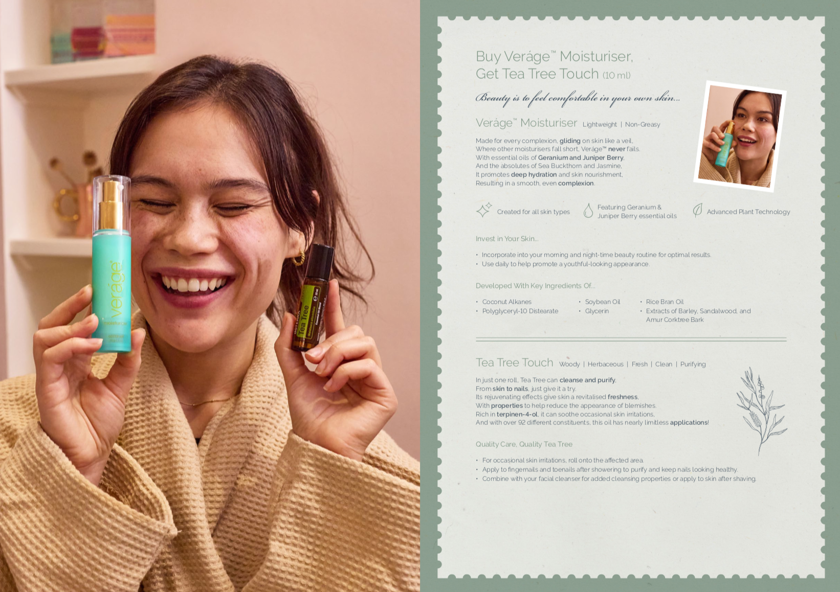 - Use alongside the Veráge Skin Care line to further your experience of CPTG-infused skin care products.